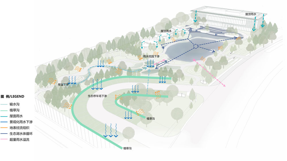 項(xiàng)目現(xiàn)場(chǎng)依形就勢(shì),利用現(xiàn)狀水塑造海綿水系,打造低生態(tài)影響、低維護(hù)的生態(tài)濕地公園;公園綠地依靠雨水花園、下凹綠地等對(duì)雨水進(jìn)行過濾下滲,超量雨水溢流對(duì)湖體進(jìn)行補(bǔ)水;停車場(chǎng)由于汽車帶來機(jī)油和重金屬的影響,不再排入湖體,直接在植草溝進(jìn)行下滲凈化;湖體通過水泵循環(huán)造流,防止水系局部富營(yíng)養(yǎng)化,并通過植被群落配置及各類生物,構(gòu)建穩(wěn)定的水生態(tài)系統(tǒng)。