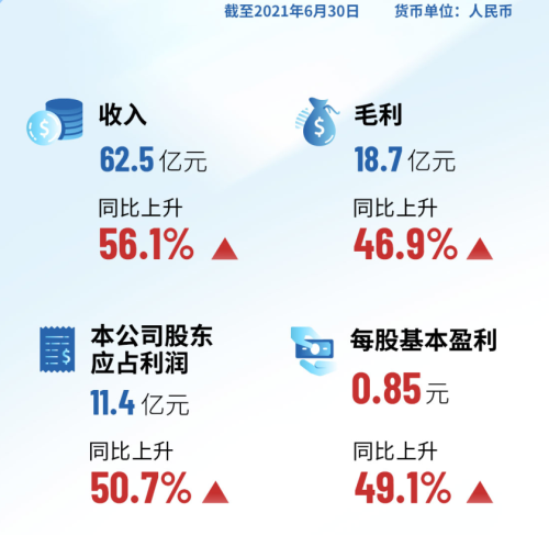 2021年上半年,集團業(yè)績實現(xiàn)高質(zhì)量發(fā)展。公告顯示,集團上半年營業(yè)額為人民幣62.47億元,較去年同期增長56.1%;毛利18.73億元,同比增加46.9%,毛利率為30.0%;股東應占利潤為11.42億元,同比增加50.7%。每股基本盈利為0.85元。