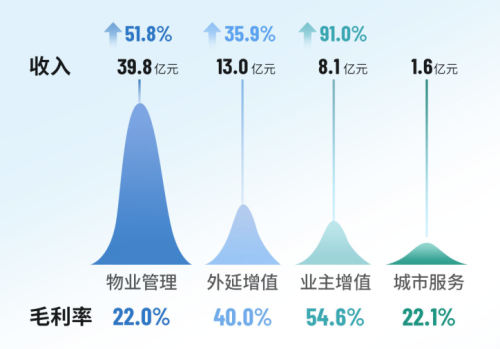 通過精細化運營及科技賦能,雅生活集團運營效益穩(wěn)步提升,收入結(jié)構(gòu)進一步優(yōu)化,核心業(yè)務占比提升至近八成,核心業(yè)務毛利占比超七成。其中,物業(yè)管理服務收入同比增長51.8%至39.77億,外延增值服務收入同比增長35.9%至13.03億元,業(yè)主增值服務收入同比增長90.9%至8.07億元,城市服務收入達1.59億元。