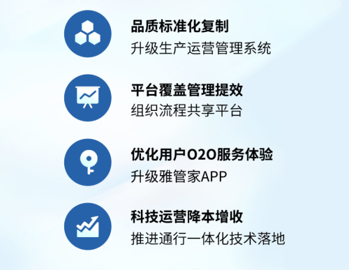未來,雅生活集團將著力打造五大核心競爭力,分別為服務產(chǎn)品力、市場拓展力、科技運營力、整合組局力以及高效組織力。集團將始終堅持品質(zhì)核心,持續(xù)提升服務標準化,不斷創(chuàng)新、迭代服務產(chǎn)品,打磨服務產(chǎn)品及口碑,梳理不同業(yè)態(tài)服務產(chǎn)品標桿。
